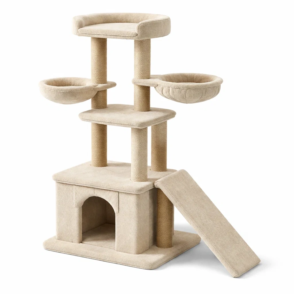 Arbre à chat en sisal et tissu beige avec niche et hamac