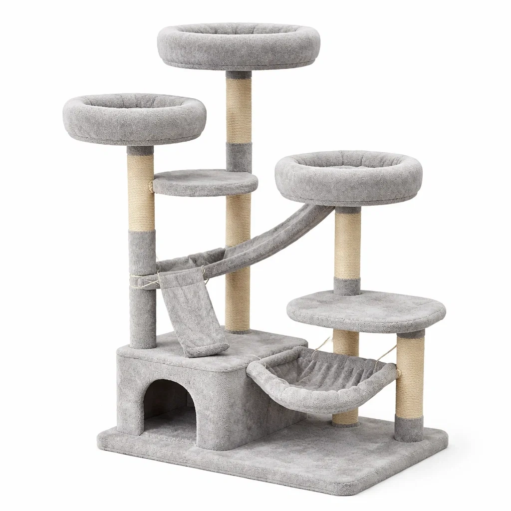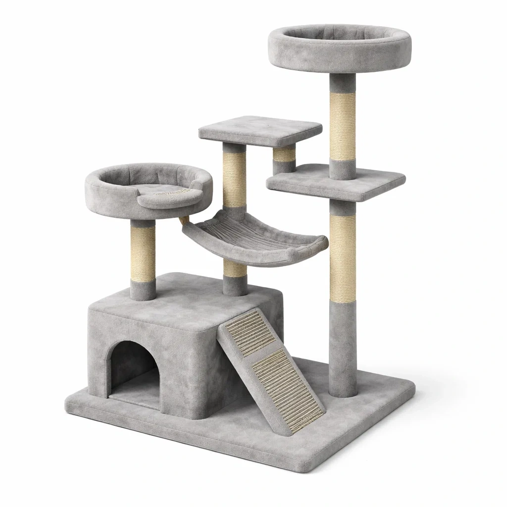 Arbre à chat en bois avec corde de sisal et tissu peluche gris