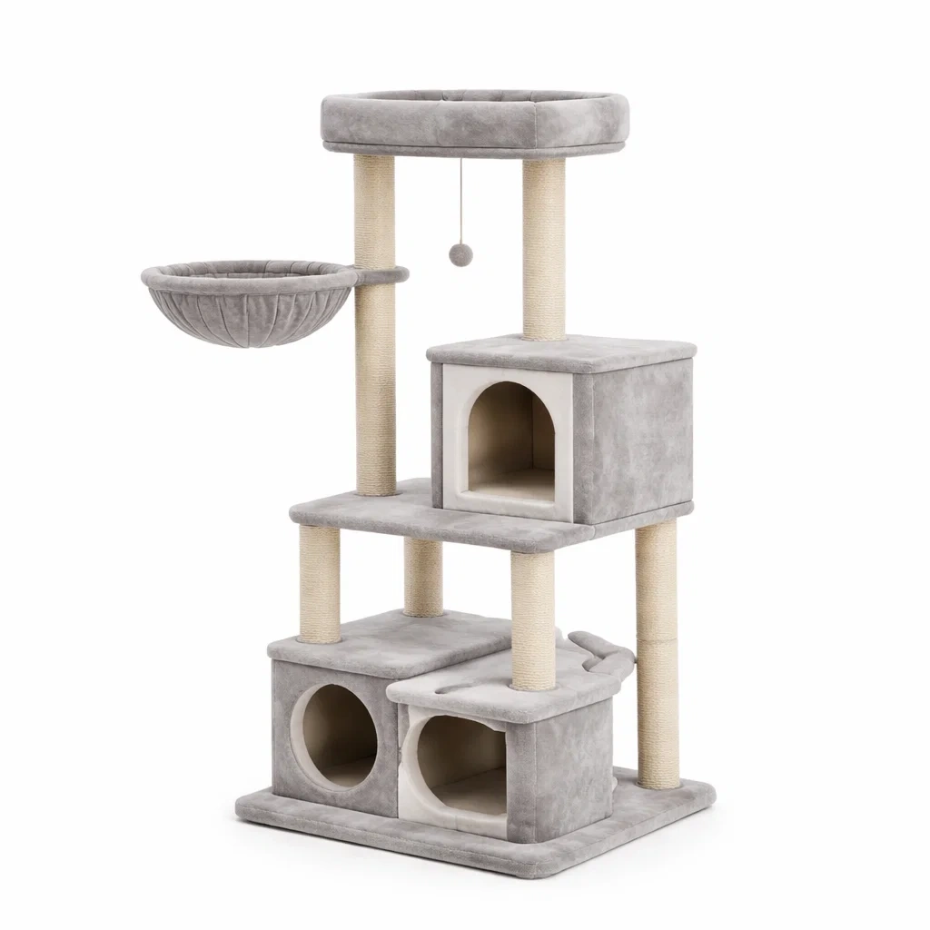 Arbre à chat en peluche et sisal gris avec niches et hamac 145 cm