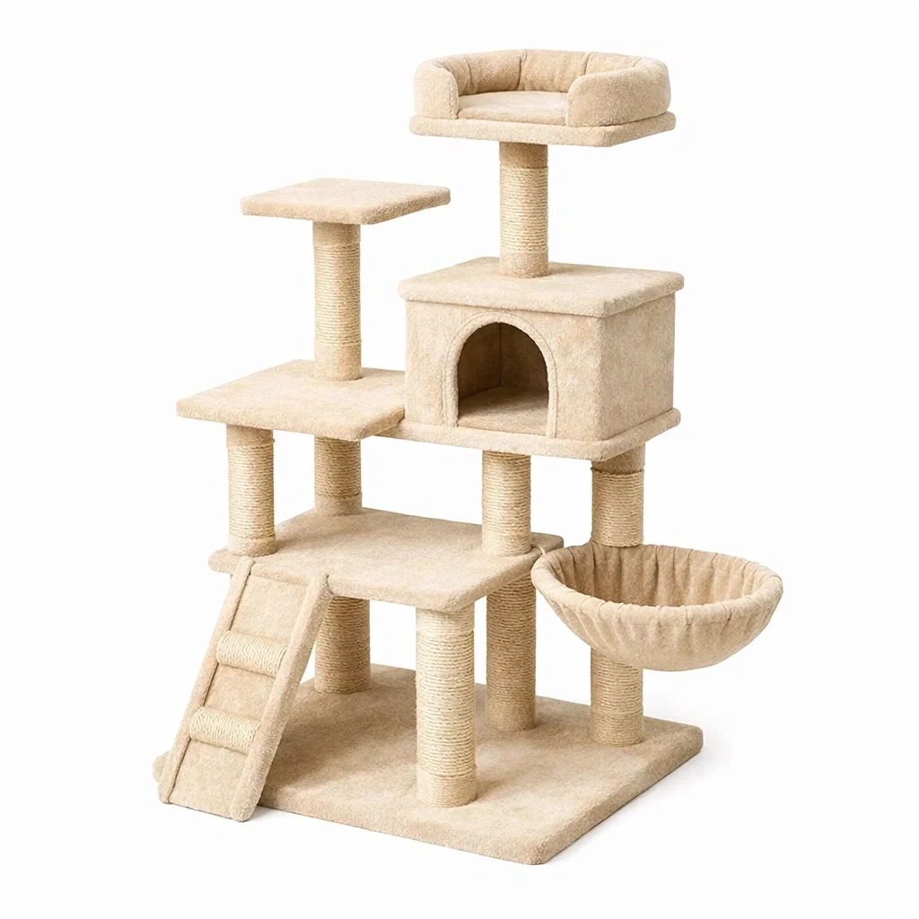 Structure: Comprend plusieurs plateformes, une niche, un hamac et un escalier en tissu polyester doux.