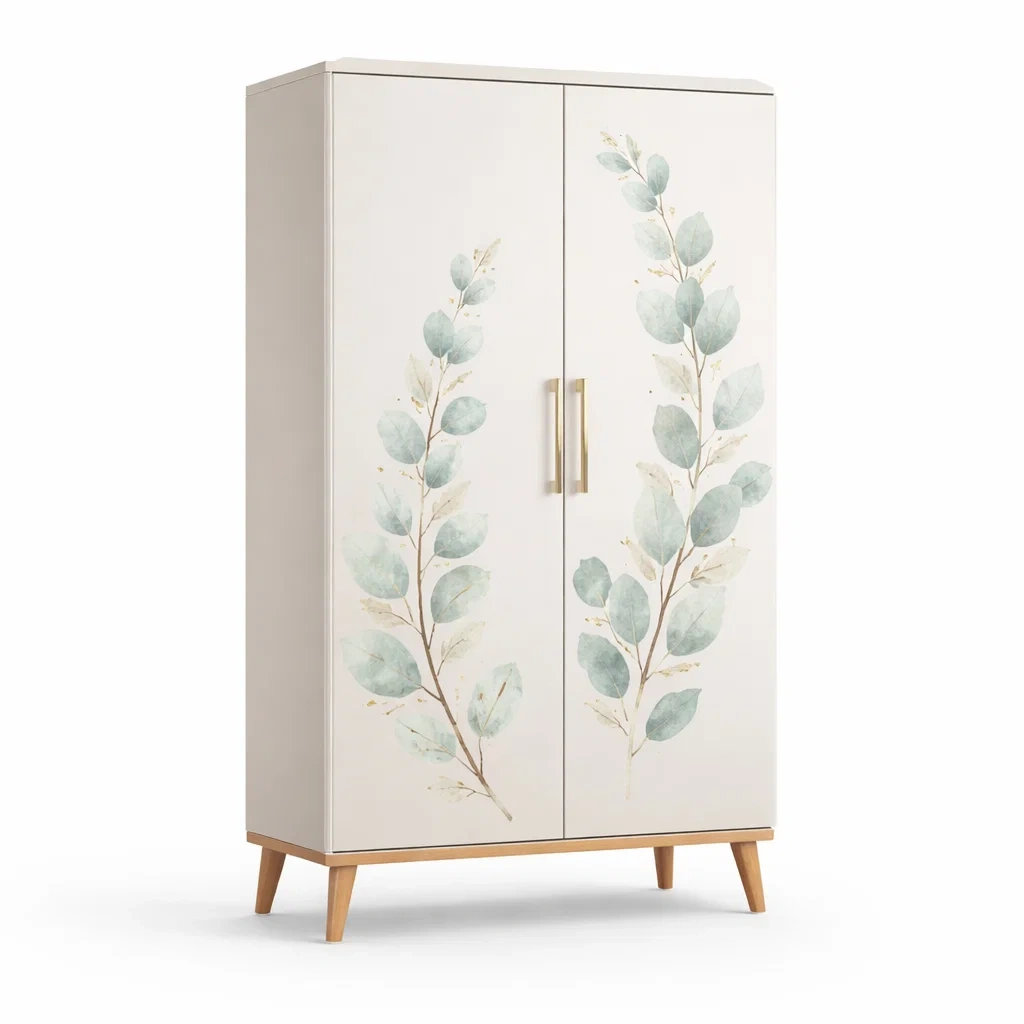 Armoire avec structure en panneaux de bois MDF et pieds en bois massif. Les portes sont décorées d'un motif de feuilles artistiques. Les poignées sont en métal doré.